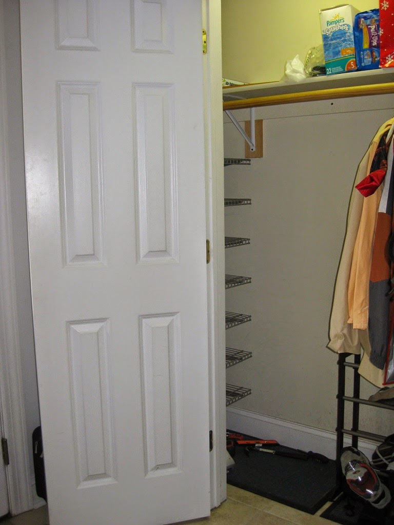 Finally put up the shoe rack in the coat closet last weekend, I have been searching for a shoe storage system that fits this area in the closet and I couldn't find anything. I wanted the shoes to go in that nook because it was sort of hidden at the side and wasn't immediately visible when you open the doors. It was also a weird size (23 inches wide) so I needed something that was adjustable and stackable.